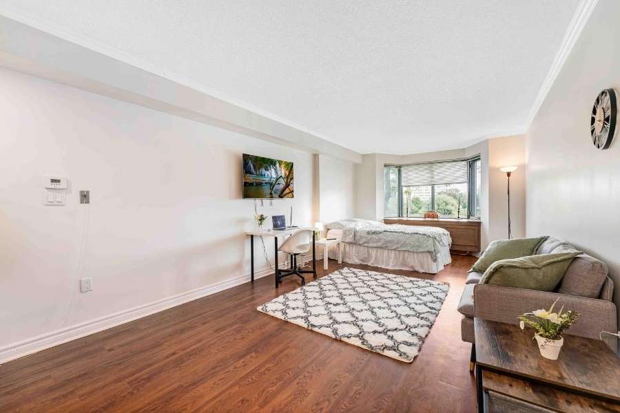 Un studio lumineux avec parquet en bois, canapé, coin bureau et lit, représentant un exemple de biens immobiliers disponibles à la location ou à la vente.